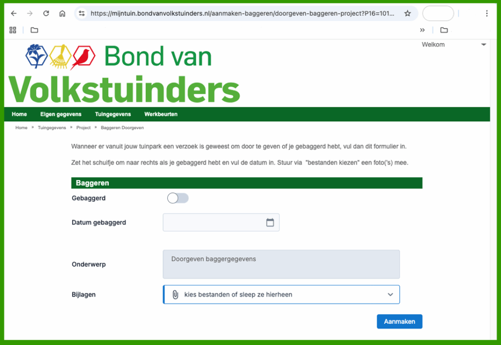 Opgeven van het baggeren gaat via Mijn Tuin, aangezien het baggeren, evenals het algemeen werk, onder het contract valt dat je met de Bond van Volkstuinders hebt.